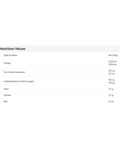 Milk Chocolate (74%), (sugar, cocoa butter, skim milk powder, cocoa mass, whey (milk), vegetable fat (palm oil SG), full cream milk powder, butter oil (milk) Emulsifier: Rapeseed Lecithin (E322), Glazing agents: gum arabic (E414), shellac (E904). Banana Chips (sugar, coconut oil) (26%). Milk chocolate contains vegetable fat in addition to Cocoa Butter. Cocoa solids 20% min, Milk solids 20% min.