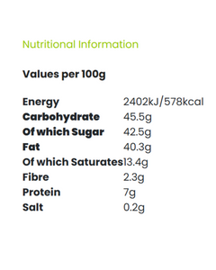 Energy 2412kJ/580kcal Carbohydrate Of which Sugar Fat 47.1g 44.3g 40.3g Of which Saturates 17.7g Protein 6.3g Fibre 1.6g Salt 0.2g